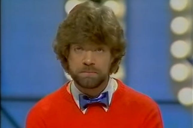[Image description: Matthew Kelly wearing a bright red jumper with a shiny bowtie at the collar. His face is arranged into his signature comedic deadpan expression]