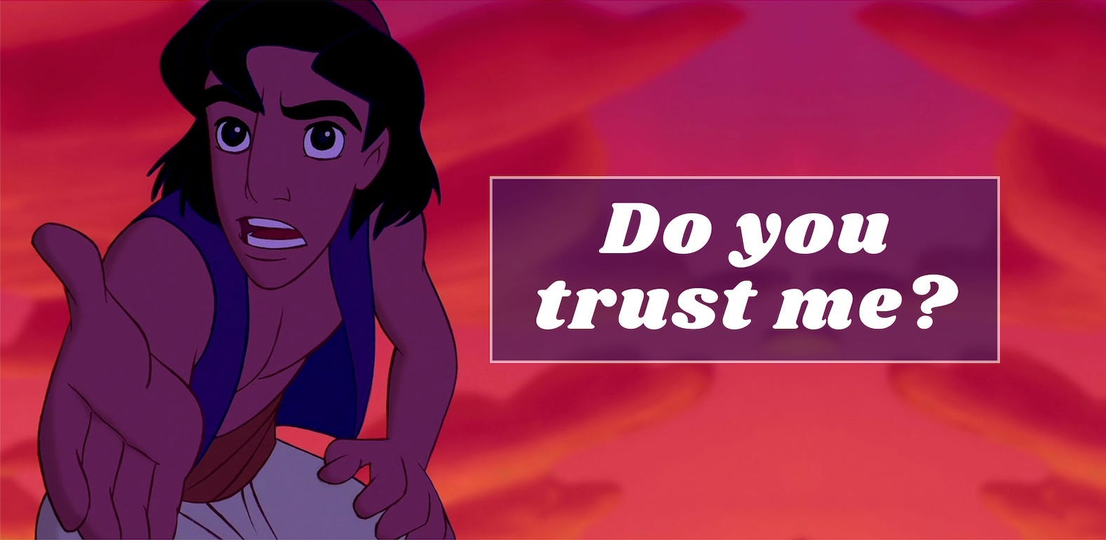 [Image description: Aladdin from the Disney animation reaches his arm out in the famous ‘Do you trust me?’ pose]