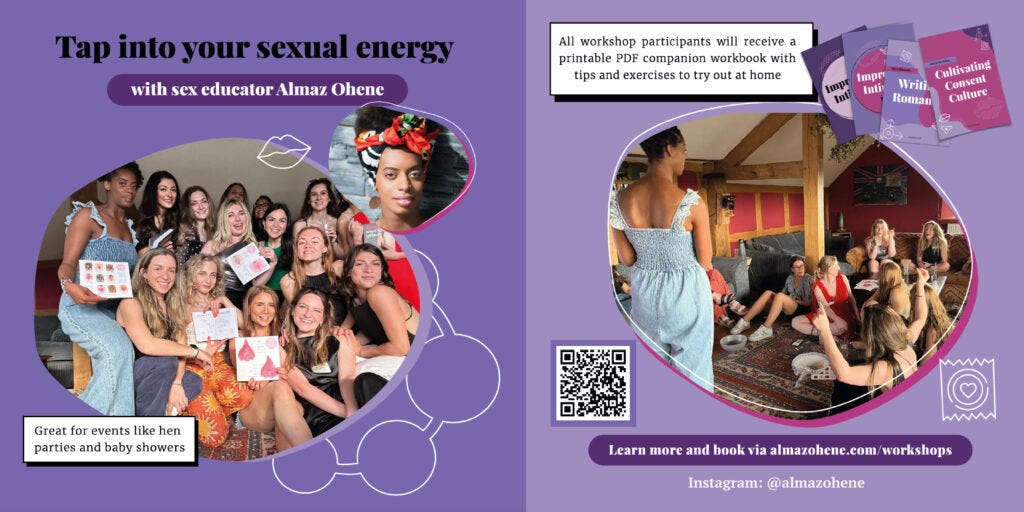 I run 4x workshops (in-person and/or online) about sex and intimacy. Whether you’re looking to boost your sensual confidence, explore your sexual expression, or deepen your intimate connections, these workshops are here to help you do it both playfully and powerfully. Perfect for hen parties, baby showers, birthdays… or just because.